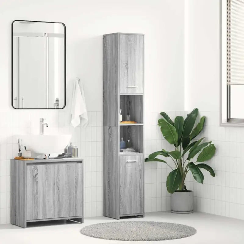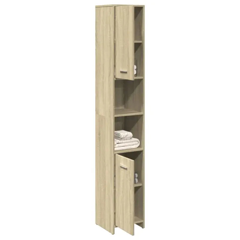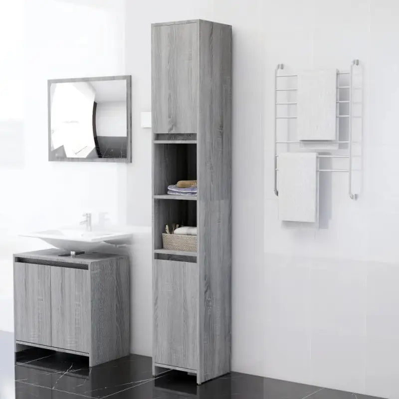Deze chique kast is gemaakt van bewerkt hout, waardoor hij stevig en stabiel is. De badkamerkast heeft 3 vakken en 2 deuren, waardoor je verschillende opbergopties en extra ruimte hebt om dingen in je badkamer op te bergen. Elke deur heeft een handgreep voor gemakkelijk openen en sluiten. De kast is eenvoudig schoon te maken met een vochtige doek.