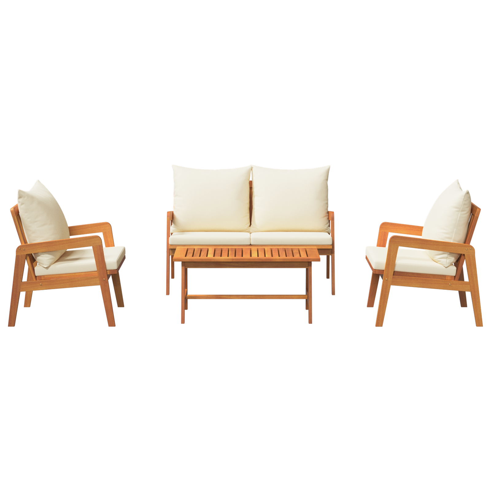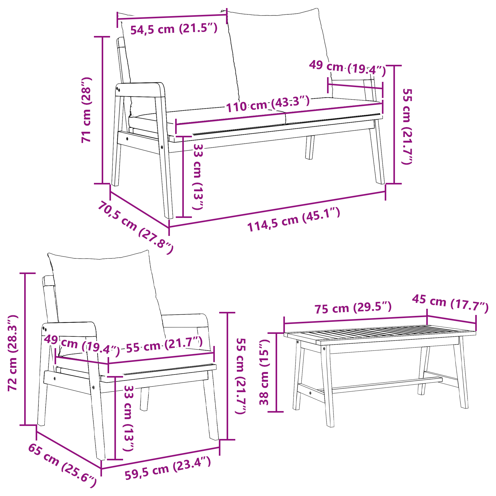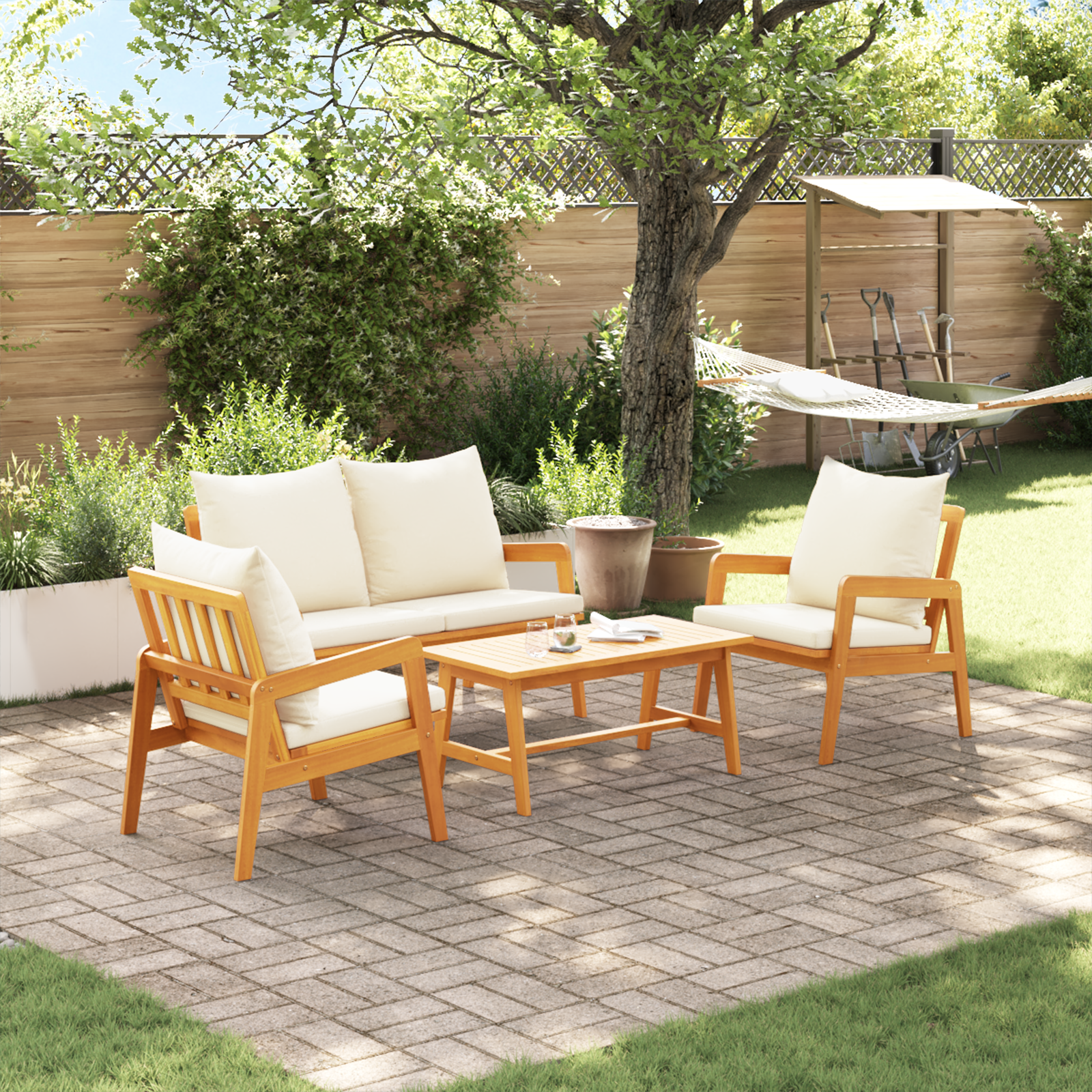 - Kwaliteitsmateriaal: Gemaakt van massief acaciahout, deze sofa set gaat lang mee en ziet er super uit. De geoliede afwerking maakt het niet alleen mooi, maar ook vochtafschermend zodat het in topvorm blijft.