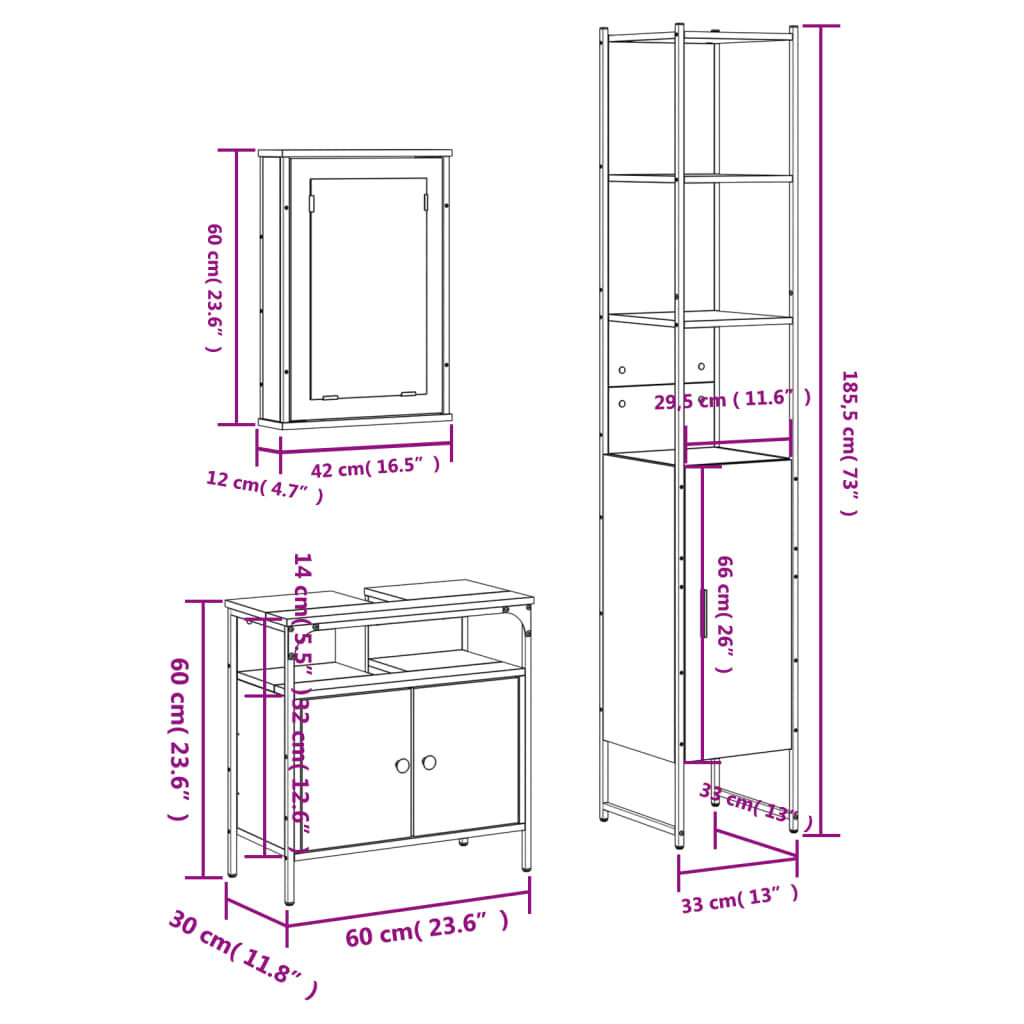 vidaXL 3-delige Badkamermeubelset bewerkt hout grijs sonoma eikenkleur
